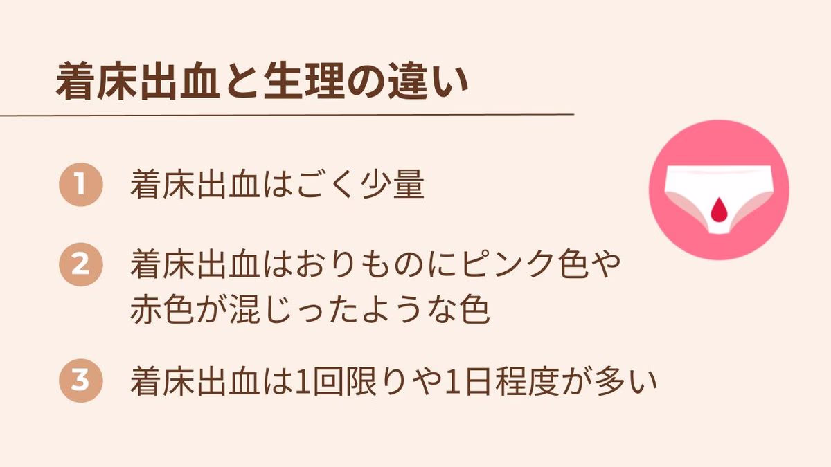 えて、出血の色や期間も見分けるポイントとなります。着床出血の色はおりものにピンク色や赤色の血が混じったような色で、生理のような赤黒い出血はありません。