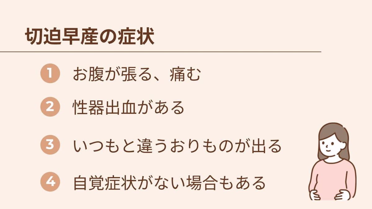 お腹の張りや痛みは、切迫早産でよくある症状です。