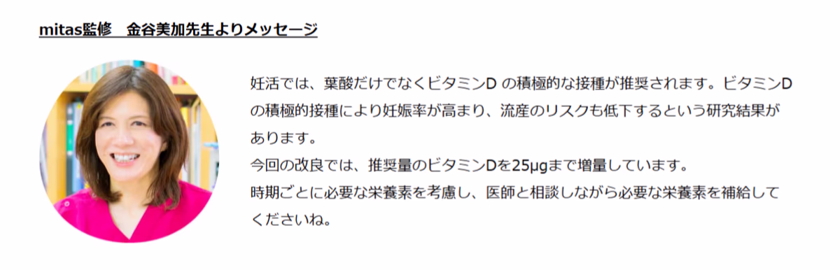また、葉酸のほかにも、ビタミンDも妊娠のしやすさや出生率の向上に効果が期待される重要な栄養素。mitasには、監修医のもと業界最多クラスの25μgのビタミンDが配合されています。