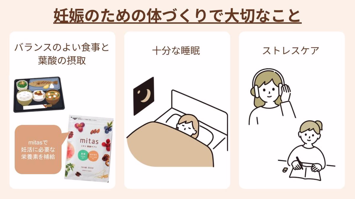 妊娠に向けた準備としては、バランスの取れた食事や十分な睡眠に加え、妊活サプリ「mitas」を活用することで、無理なく進めることができます。