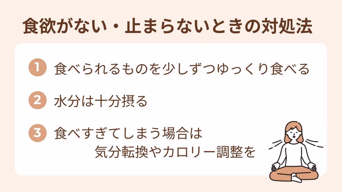 逆に食欲があり過ぎる場合は、過剰な体重増加につながる可能性があります。食べることばかりに目が行かないように、適度に体を動かして気分転換をしたり、食べるもののカロリーを調整したりすることを意識しましょう。