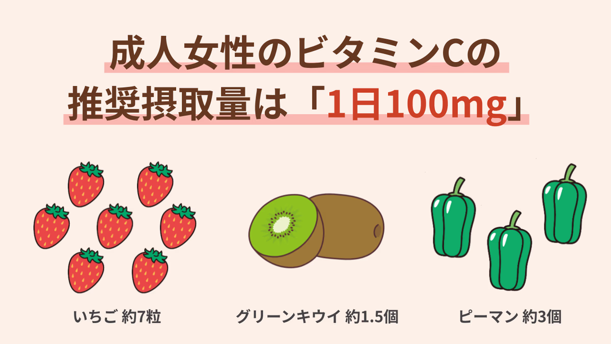 厚生労働省が定める「日本人の食事摂取基準(2020年版)」によると、成人女性のビタミンCの推奨摂取量は「1日100mg」です。妊活中も、まずはこの量を目安にするとよいでしょう。