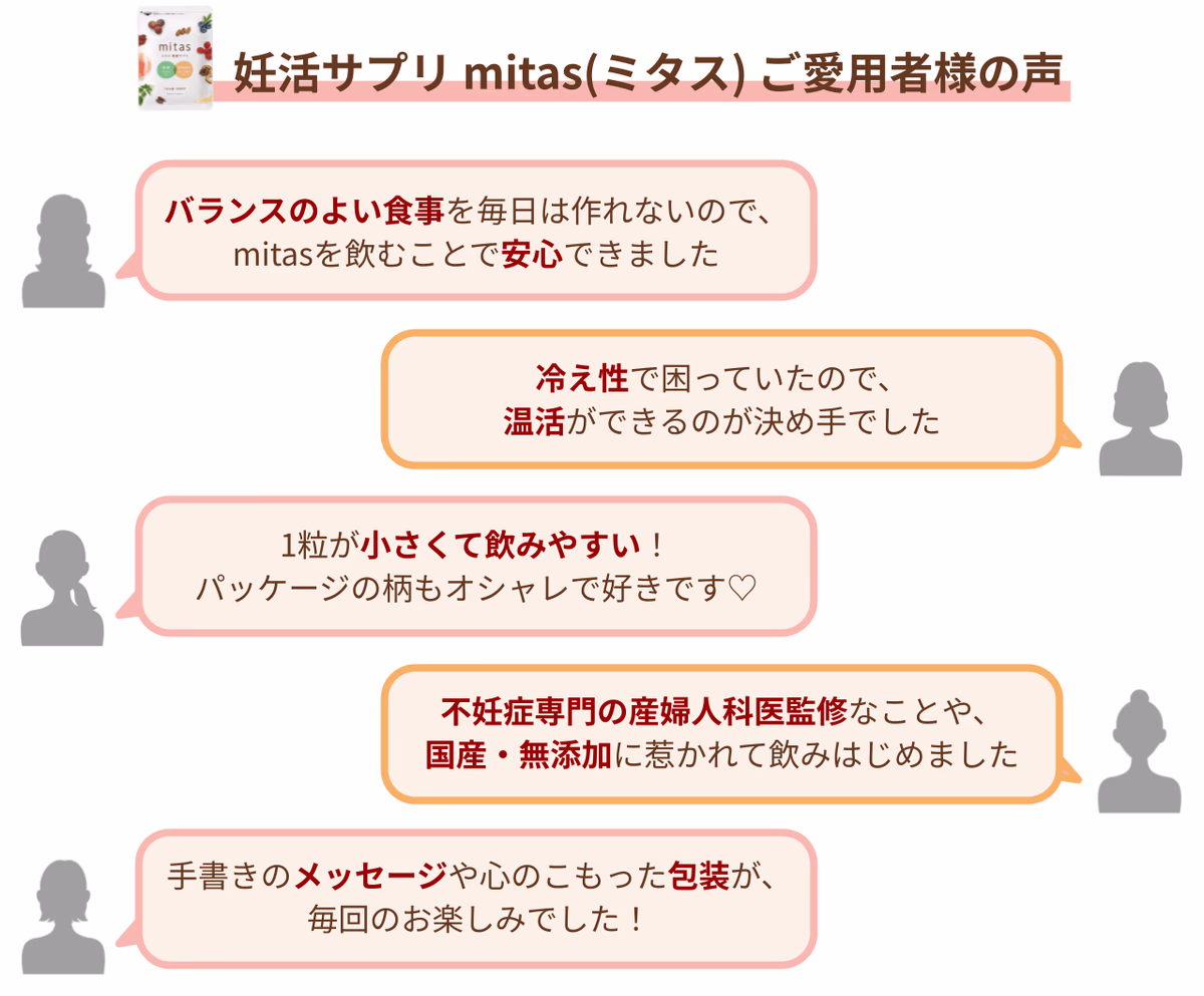 妊活期に口にするものだからこそ、品質には徹底的にこだわりたいもの。mitasは、不妊症専門クリニックの産婦人科医が監修しており、専門家の知見を活かして妊活に必要な成分を適切なバランスで配合しています。