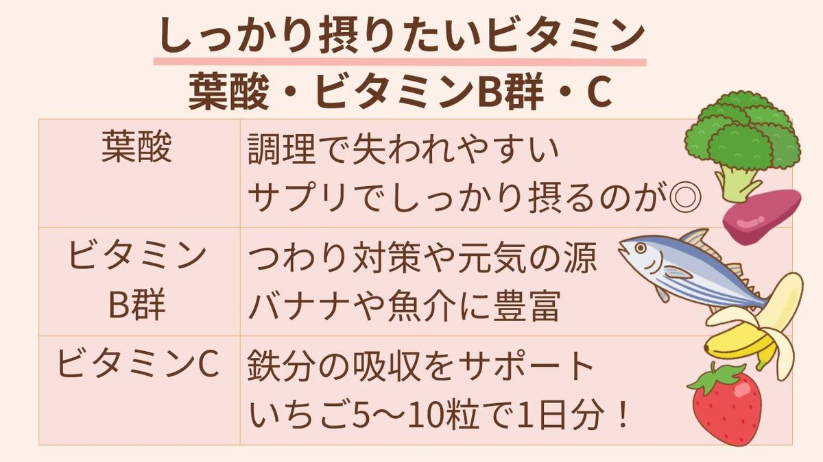 まずは優先度の高い葉酸やビタミンB群を意識しつつ、どうしても足りない部分は信頼できるサプリメントに「バトンタッチ」してしまいましょう。