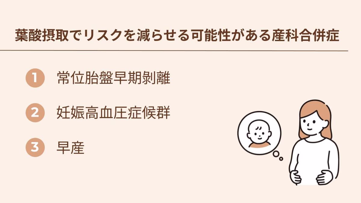 妊娠中に葉酸を摂取することで、産科合併症のリスクを減らせる可能性があります。具体的に、リスクを減らせる可能性があるとされている産科合併症は、以下のとおりです。