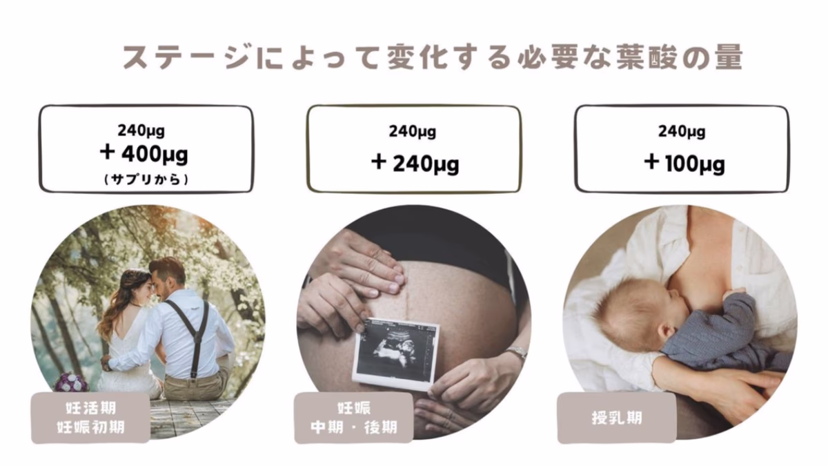 妊活中は、将来の妊娠に備えて体の環境を整える大切な時期。厚生労働省では、妊娠を希望する女性は通常の食事から1日あたり240µg、加えてサプリから400µgを追加で摂取することを推奨しています(※1)。